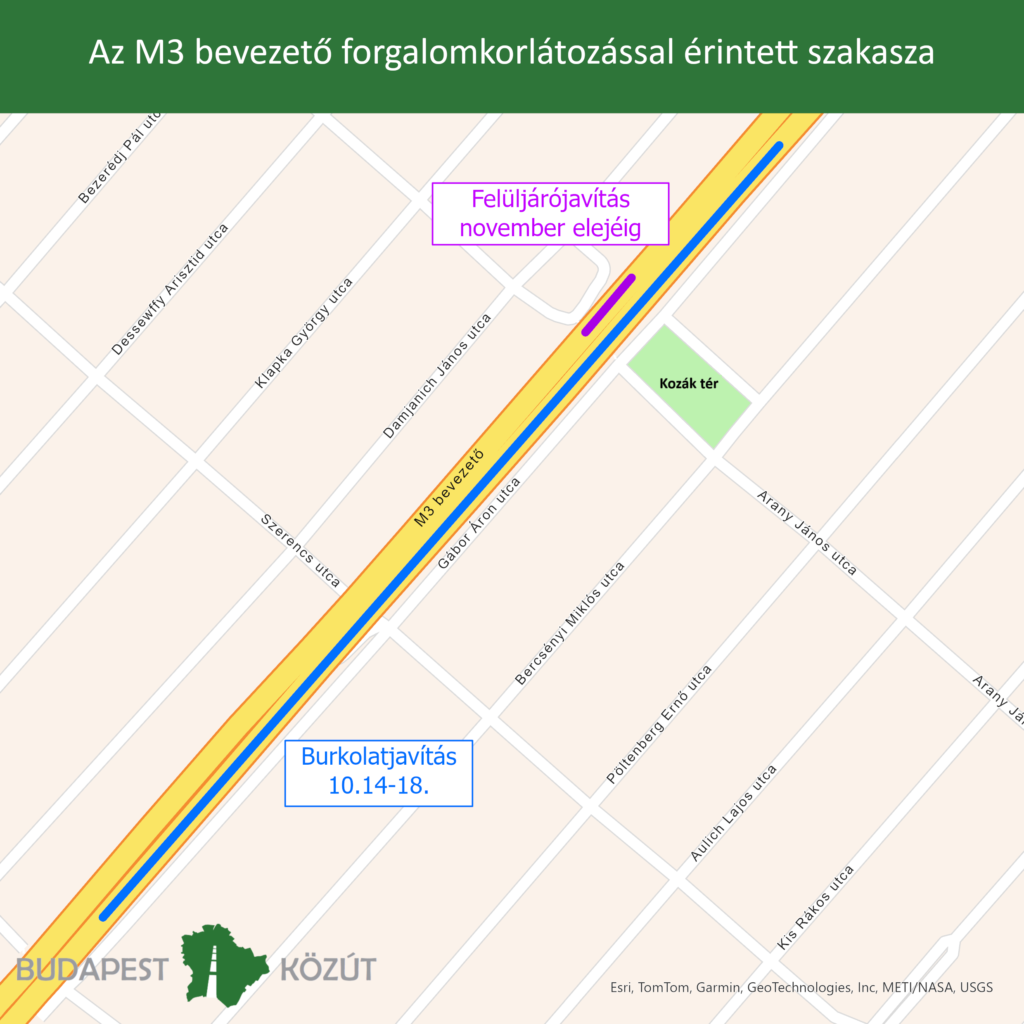 Október 14-től várhatóan október 18-ig a Budapest Közút aszfaltburkolat-cserét végez az M3 bevezető városhatár felé vezető útpályáján a Szerencs utcai csomópont környezetében. A munkálatok ideje alatt a három sávból egy lesz rövid szakaszon lezárva a forgalom előtt, kettő sávon folyamatosan lehet haladni. A Szerencs utcánál a keresztirányú közlekedés biztosítva lesz. A forgalmas útszakasz burkolatjavítását még a hideg, fagyos idő beállta előtt szükséges elvégezni. A bevezető centrum felé tartó oldalán – szintén a Szerencs utca közelében – a Kozák téri felüljáró javítása zajlik egy sáv lezárása mellett, melyre egy kamion okozta sérülés miatt van szükség.